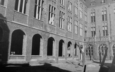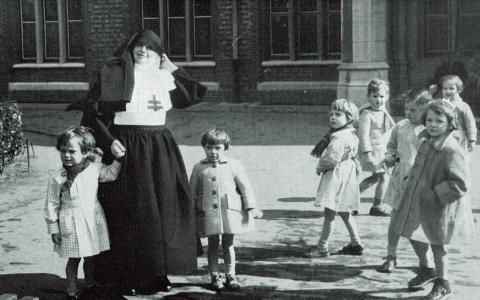 Wereldoorlog II. Hoewel de zusters meer dan eens een deel van de school af moeten staan aan de Duitse bezetter, schrikt men er niet voor terug om op hetzelfde moment onderdak te verlenen aan enkele joodse kinderen.