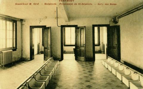 Gebouwd in 1909 n.o.v. provinciaal architect Jules Taeymans (oostkant verhoogd in 1932). Omvatte o.a. een feestzaal en een kapel. Het prachtige trappenhuis werd vernield door brand (1962).