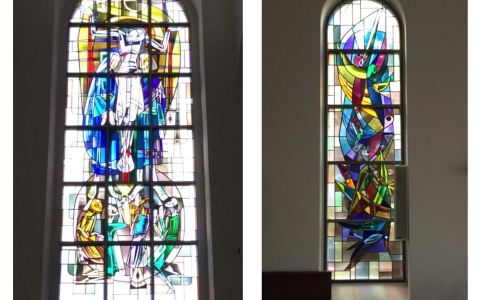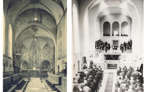 Het kerkschip (nu kerkzaal) is het koor van de oude minderbroederskerk (1670). In 1958 werd dit vergroot tot de huidige Kerk van de Verrezen Christus (n.o.v. René Van Steenbergen sr.). Het geheel werd hersteld na een zware brand in 1997.