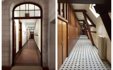 In de T-blok komt in 1922 de prachtige parketzaal, met erboven een studie (later: ’t Rapenkot) en een tekenzaal (arch. Jules Taeymans).