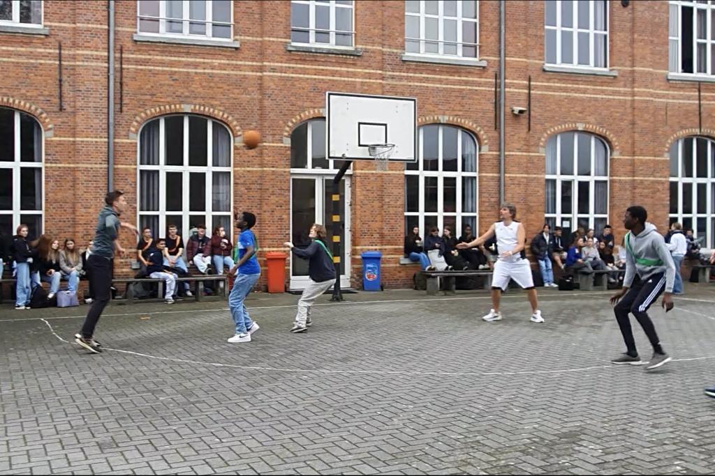Tijdens een 3x3 basketbaltornooi op campus Klinkstraat leggen leerlingen het vuur aan de schenen bij de leerkrachten.